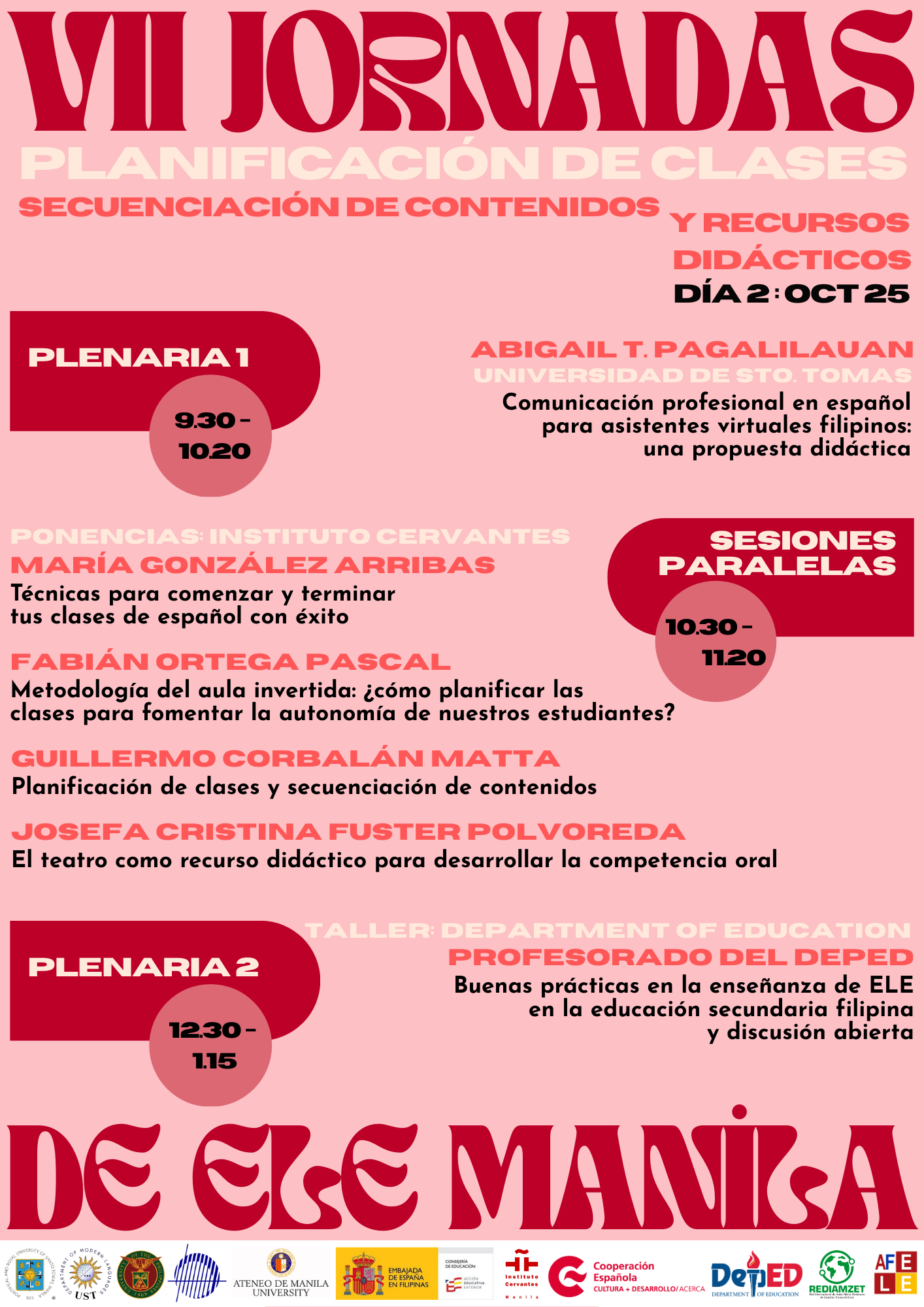 Entre las actividades que se llevarán a cabo a lo largo del evento, destaca la presentación del libro A Context-Sensitive, Culturally-Responsive, Open-Access Digital Textbook of Spanish as a Foreign Language for Filipino Teachers and Learners, un manual de acceso libre destinado a responder a los desafíos históricos de la enseñanza del español en el sistema educativo filipino. Asimismo, también tendrá lugar el lanzamiento de AFELE (Asociación Filipina de Enseñanza de ELE), que se trata de la primera red nacional de profesores de español en Filipinas, con el objetivo de proporcionar formación continua, recursos y apoyo a los docentes de español en el país.