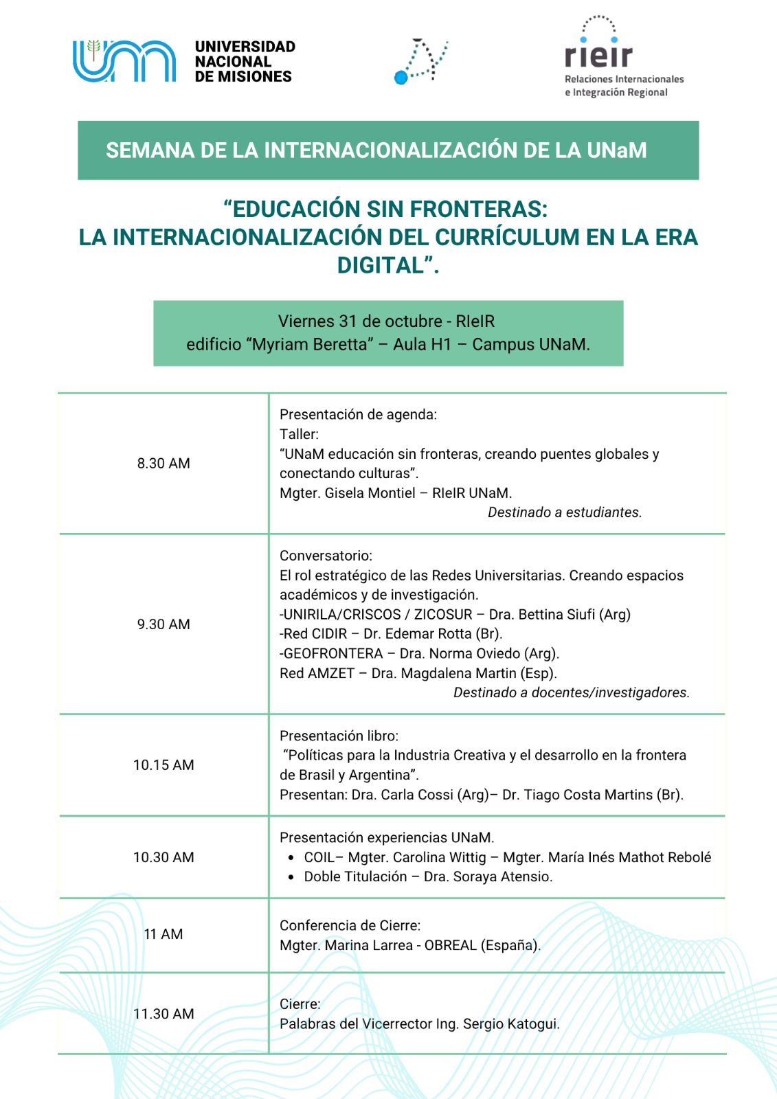 Los días 30 y 31 de octubre se desarrollarán actividades, conferencias y conversatorios a cargo del equipo de Relaciones Internacionales e Integración Regional (RIeIR UNaM), entre las que se encuentra el conversatorio mencionado en el que estará presente la REDIAMZET, una red internacional consolidada que cuenta ya con 13 aulas —además de otros centros colaboradores—, entre ellas, la de la UNaM, coordinada por Gisela Belén Montiel y a la cual están asociadas otras ocho universidades argentinas.