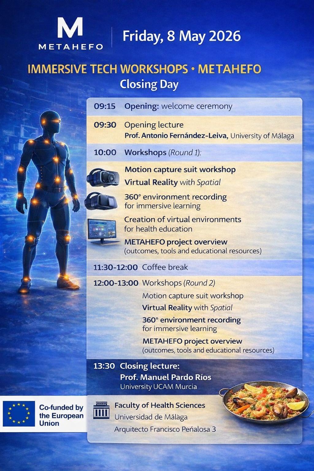 El encuentro incluirá además la Jornada de Clausura del Proyecto Erasmus+ METAHEFO (Innovative Technologies in Health Education), gestionado a través del Vicerrectorado de Movilidad y Proyectos Internacionales, coordinado por la Universidad de Málaga y cofinanciado por la Unión Europea, lo que refuerza su dimensión internacional y su impacto en el ámbito de la innovación docente en Ciencias de la Salud.