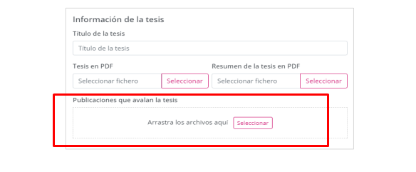 Es muy importante tener en cuenta que si en el PDF de la tesis van incorporados archivos del texto completo de los artículos que la avalan, es posible que salga un porcentaje de similitudes muy elevado, debido a que el sistema compara el documento con la fuente de la editorial donde se haya publicado. Para evitar este problema, es preferible que las publicaciones su suban aparte, como archivos independientes, en el proceso de solicitud de defensa en el apartado destinado a ello (ver imagen)