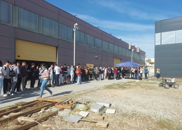 A continuación, el estudiantado acompañado por su profesorado, ha podido disfrutar de una demostración en directo de uno de los rovers cedidos por la Agencia Espacial Europea (ESA) al Space Robotics Lab de la Escuela, grupo de investigación liderado por el profesor Pérez del Pulgar y dedicado al desarrollo de tecnologías robóticas aplicadas a la exploración de otros planetas.