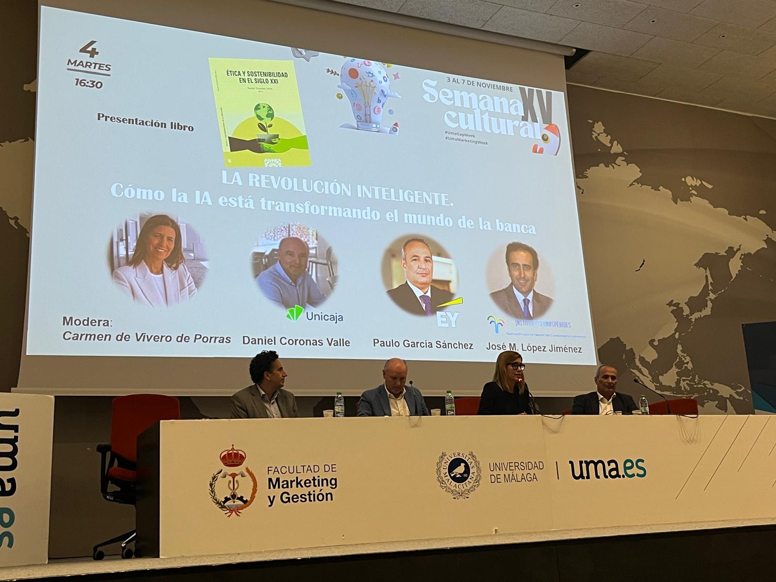 Por la tarde, Daniel Coronas, presentó su libro “Ética y sostenibilidad en el siglo XXI” seguido de la mesa redonda “La revolución inteligente: cómo la Inteligencia Artificial está transformando el mundo de la banca”. Moderada por la profesora Carmen de Vivero de Porras, y con la intervención de Javier Porras Castaño, director de Inteligencia Artificial e Innovación en Unicaja Banco, Paulo García Sánchez socio responsable de AI & Data para Servicios Financieros en Ernst & Young y José María López Jiménez, miembro del Instituto Econospérides.