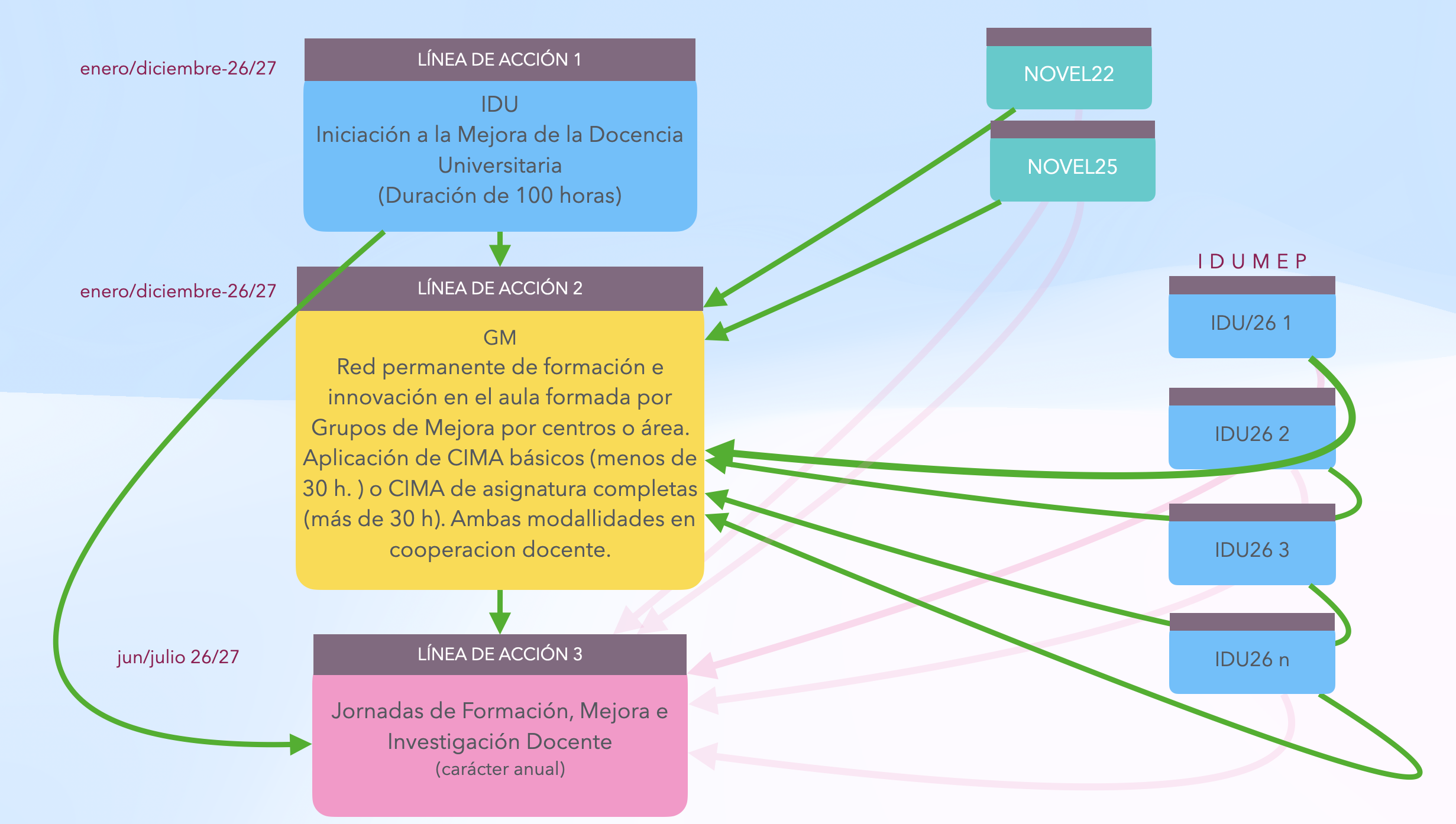 El Programa IDUMEP26/27 da continuidad al programa NOVEL25, del que mantiene sus fundamentos metodológicos y su orientación práctica, incorporando una actualización de su enfoque y una ampliación de su alcance. IDUMEP26/27 tiene como finalidad acompañar y fortalecer el desarrollo profesional del profesorado universitario, con especial atención al profesorado de reciente incorporación —como los Ayudantes Doctores en el marco de la LOSU—, pero también abierto a otros perfiles docentes que deseen reflexionar sobre su práctica y mejorarla de manera continuada. Desde una orientación basada en la práctica, el análisis crítico del aula y el trabajo cooperativo, el programa promueve una formación en conexión con la realidad del aula y progresiva, orientada a la adquisición de competencias profesionales clave, al intercambio de experiencias y a la consolidación de una comunidad docente comprometida con la calidad, la innovación y la transformación educativa. Sus principales objetivos son: - Acompañar la incorporación del profesorado de reciente incorporación a la docencia universitaria, favoreciendo el desarrollo de una identidad profesional sólida y comprometida, mediante la adquisición de competencias relacionadas con: