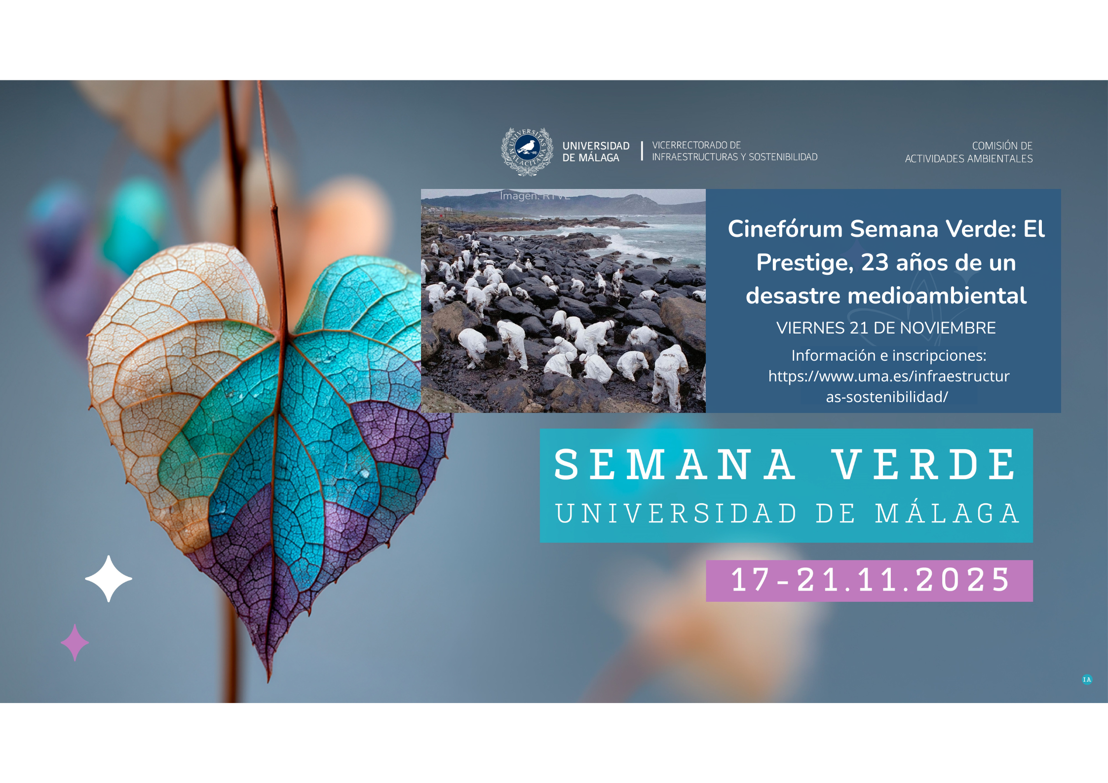 Acompáñanos en este Cineforúm de la Semana Verde: El Prestige, 23 años de un desastre medioambiental, donde veremos el documental "Prestige, tal como fuimos" y asistiremos a una interesante mesa redonda con expertos que nos darán luz sobre uno de los mayores desastres medioambientales de la historia de España.