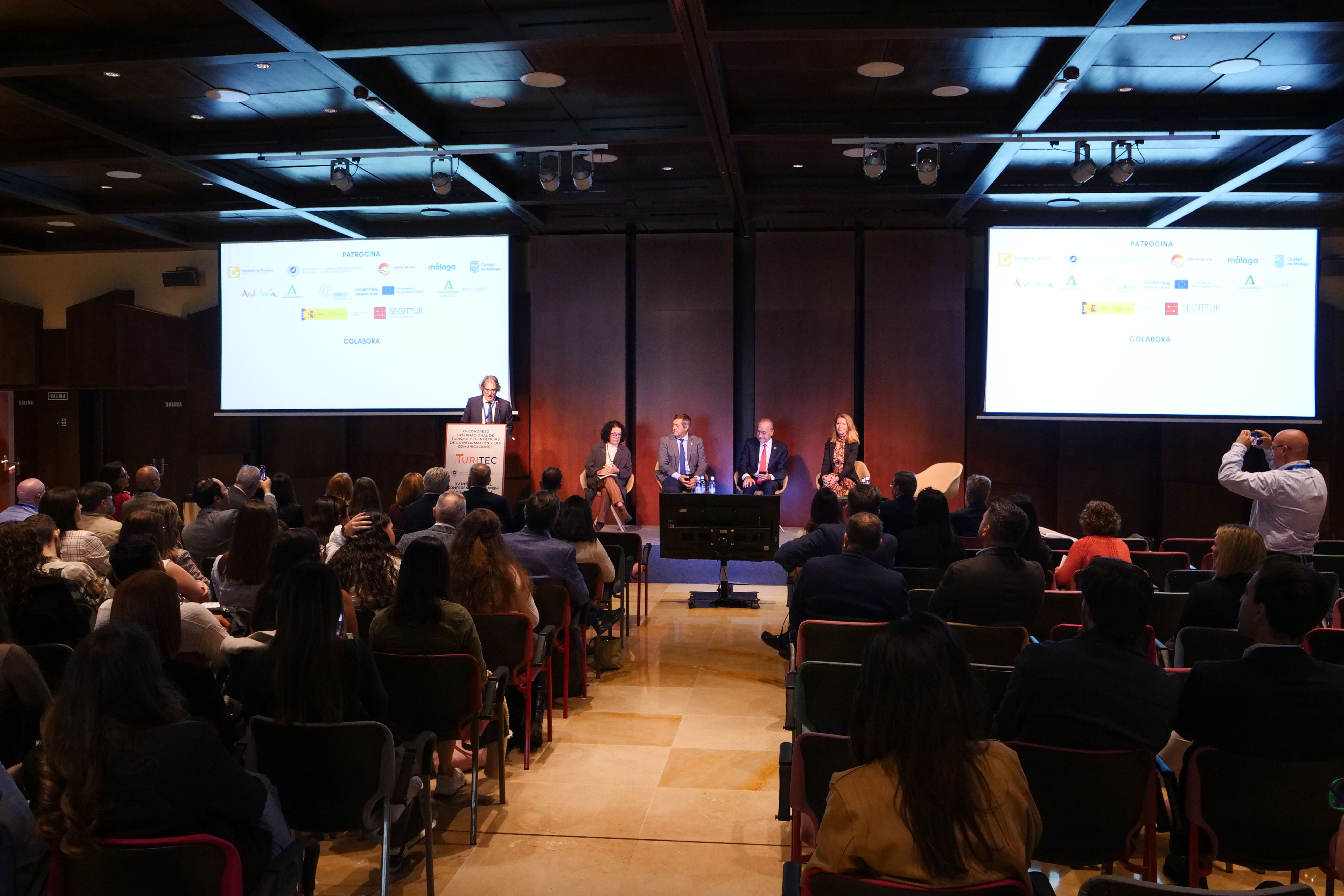 El acto inaugural de TURITEC 2025 ha contado con el rector de la UMA, Teodomiro López; el alcalde de la ciudad, Francisco de la Torre; la directora general de Ordenación Turística de la Junta de Andalucía, Elena Baena; la directora de Investigación, Desarrollo e Innovación Turística de la Secretaría de Estado de Turismo, María Velasco, y el profesor Enrique Navarro, director de IATUR.