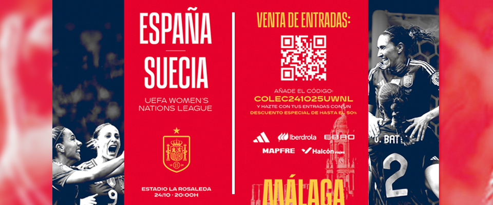 - La promoción para la asistencia al encuentro de semifinales de la European Women Nations League, partido España-Suecia, el próximo viernes 24 de octubre en el estadio de La Rosaleda. La Real Federación Española de Fútbol (RFEF) ofrece una condiciones muy especiales ala comunidad universitaria para facilitar su asistencia al partido , a través del código promocional COLEC241025UWNL en https://tickets.rfef.es/