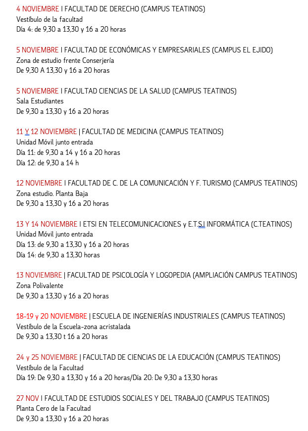 El Centro Regional de Transfusión, Tejidos y Células de Málaga, en colaboración con la UMA, nos convoca para donar sangre. El objetivo de la campaña es recibir las donaciones de la comunidad universitaria, y lo que es más importate, fomentar la donación, conviertiéndola en un hecho habitual, en el que el donante acude cada dos meses, (en computo de año tres veces la mujer y cuatro el hombre) para realizar su donación, haciendo posible que se cubran las necesidades de sangre y derivados.