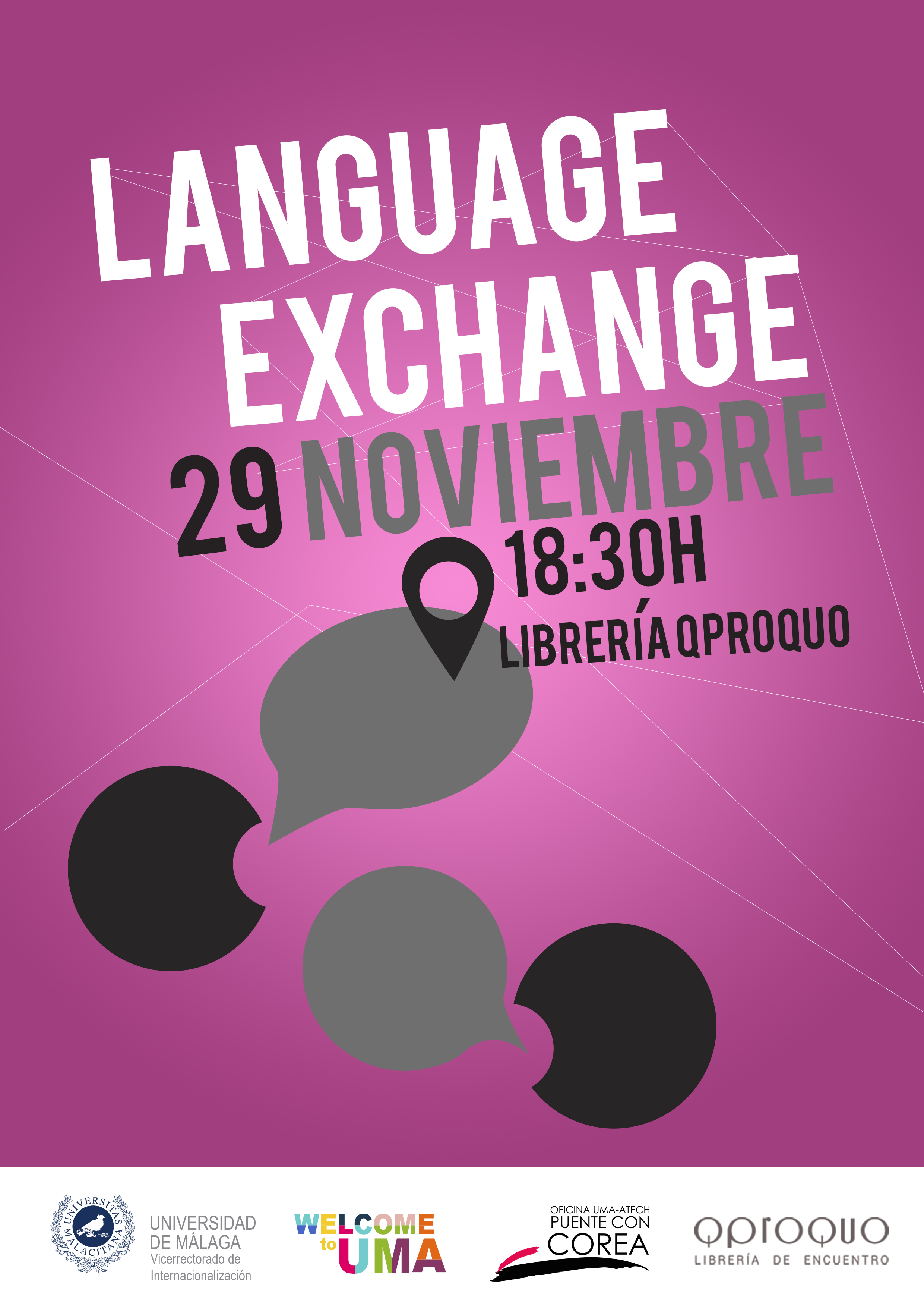 El 29 de noviembre a las 18:30 h, el Vicerrectorado de Internacionalización a través de la Oficina de Welcome to UMA de la Universidad de Málaga, organiza una nueva sesión de intercambio lingüístico y cultural dirigido a toda la comunidad universitaria.
